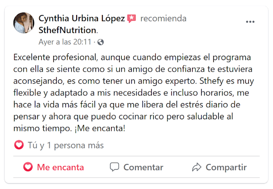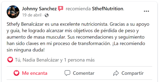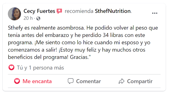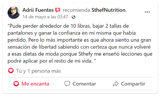 "Siempre he querido perder peso, pero no encontraba algo que funcionara. Sthefy finalmente encontró un plan de dieta para mí porque sabe lo que sabe bien y es lo suficientemente fácil de seguir! o sólo he perdido 9 kg en estos últimos meses, pero mi estado de ánimo ha mejorado también!"