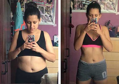 "La chica de la foto de la izquierda estaba deprimida y enojada con el mundo. La chica de la derecha nunca en su vida ha sido más segura, feliz y saludable. Me encanta todo, el fitness y mi nueva vida. Sthefy Benalcazar, Dios hizo un ángel cuando te hizo a ti."